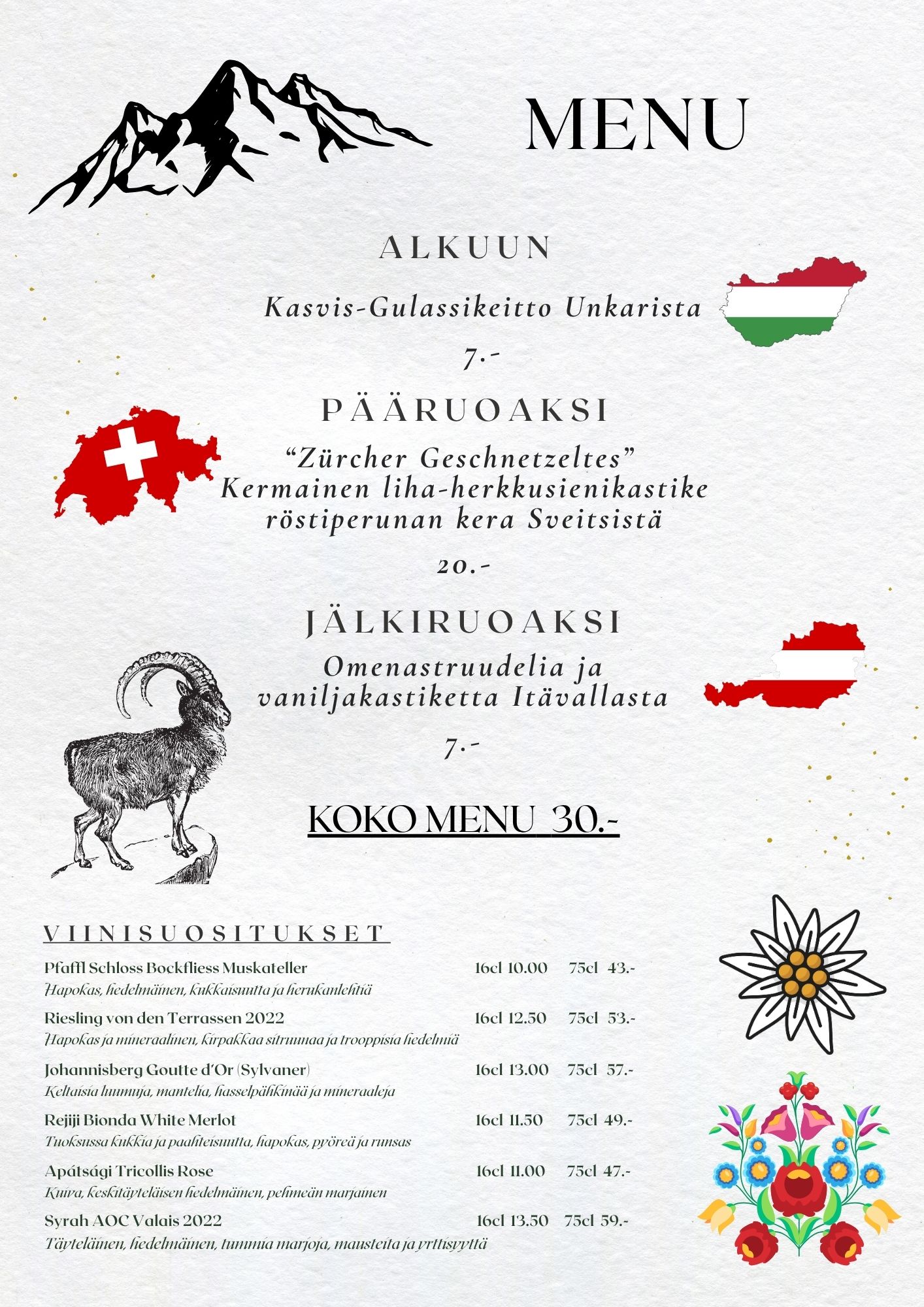 4.8.-16.8. matkaamme Alpeille ja Unkariin ja tarjolla onkin Sveitsin, Itävallan ja Unkarin keittiön ja kellareiden herkkuja