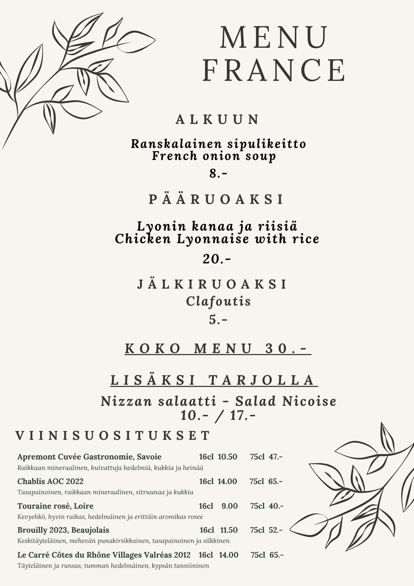 23.6.-6.7. viemme sinut Etelä-Ranskan lämpöön Lyonin kanan ja Nizzan salaatin muodossa! Viinisuosituksista löytyy pullolistamme helmiä laseittain ja samppanjaakin on lasimyynnissä 3 erilaista!